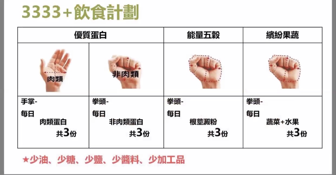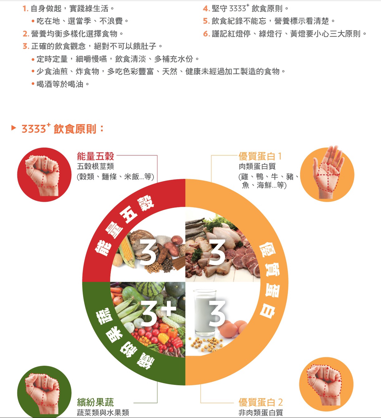 所謂3333, 指的是在我們每天三餐裡, 一共要吃下三份能量五穀類, 三份肉類蛋白質, 三份非肉類蛋白質, 以及三份蔬果. 只要把握light cooking 也就是比較健康的烹調的方式 , 多用水蒸煮, 少用市售調味醬量與加工食品, 油脂攝取上用少量而且是好的油 (一天攝取差不多2-3湯匙的油為最高限量), 這樣就能達到均衡而且健康的飲食目標.