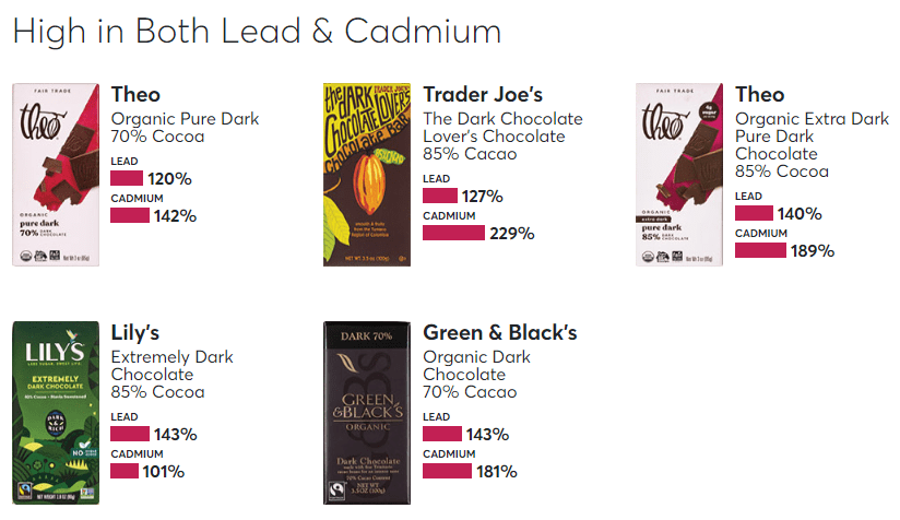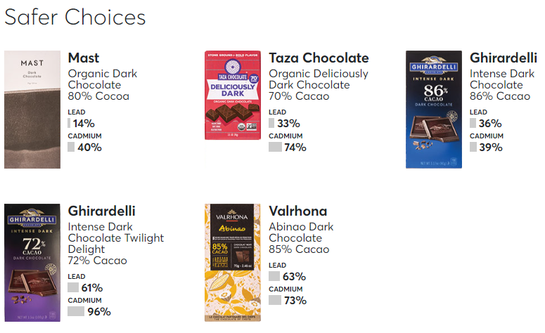 The following are the 5 safer choices that the article suggests. CR tested these bars based on California’s MADL (max allowance dose level). They are listed in order of lead level. Remember that these bars are safer not but completely free of lead and cadmium. 文章檢驗後提出較為安全的五種黑巧克力 (如下). 檢驗標準是以加州食安的含鉛跟鎘的最大可食用量來衡量. 較為安全的這五種不是不含鉛與鎘, 而是他們各自含鉛與鎘的與最大安全食用量標準相比.